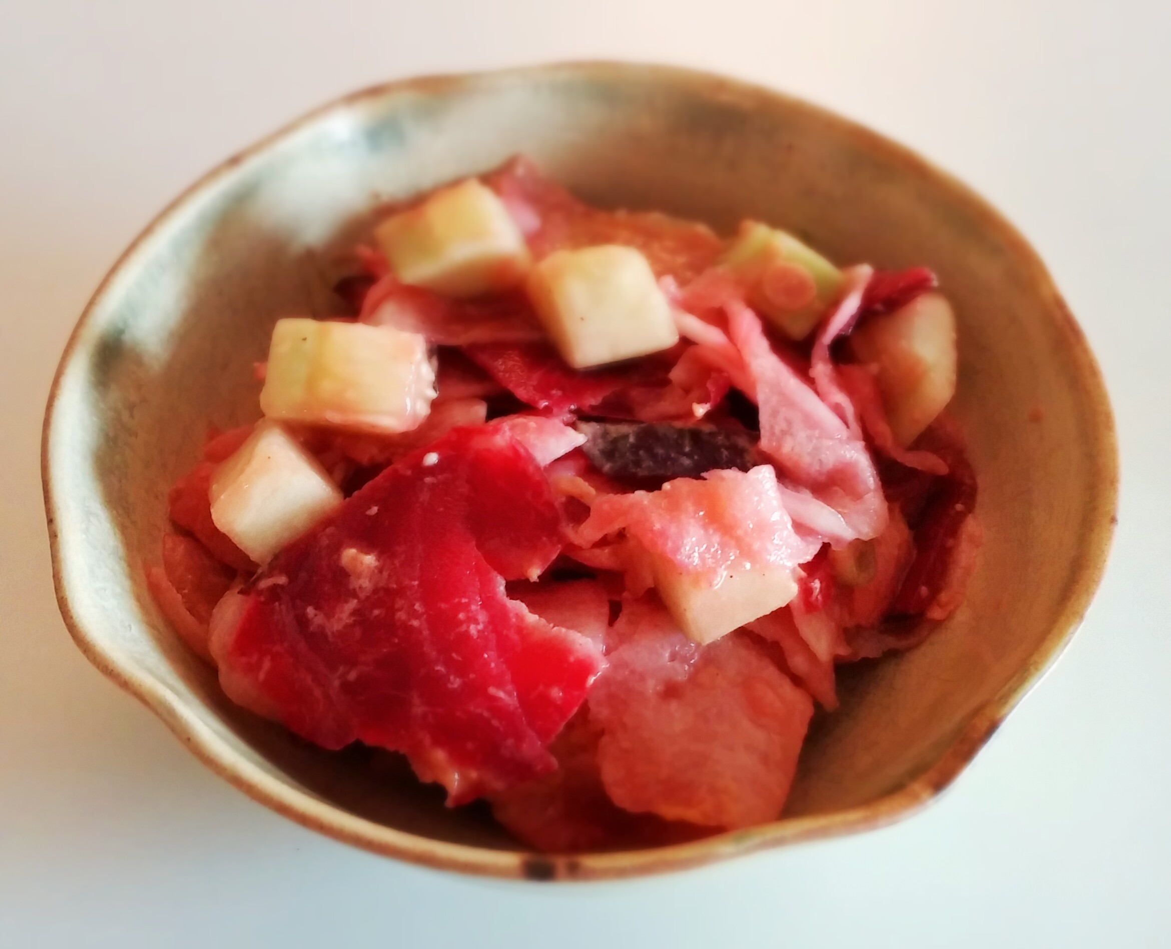Add all salad ingredients to bowl. Mix dressing ingredients well and add to salad. Toss well. This is better if you leave in your fridge for a couple of hours to allow the Daikon to really absorb the flavors of the dressing. Can also add a few pinches of salt–if you add early, it will draw water out of vegetables, which I sometimes like. Add salt late for flavor purposes only. Grated carrot also goes nice in this.